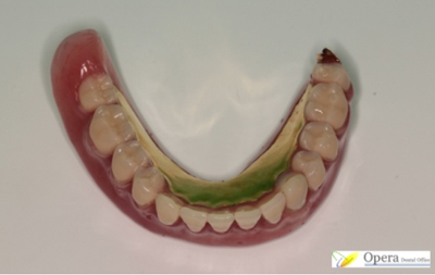 総義歯の場合、吸着は後ろの縁での封鎖によって行われるため、後ろを短くしたり天井をなくしたりすると入れ歯が簡単に落ちてくるようになります。
